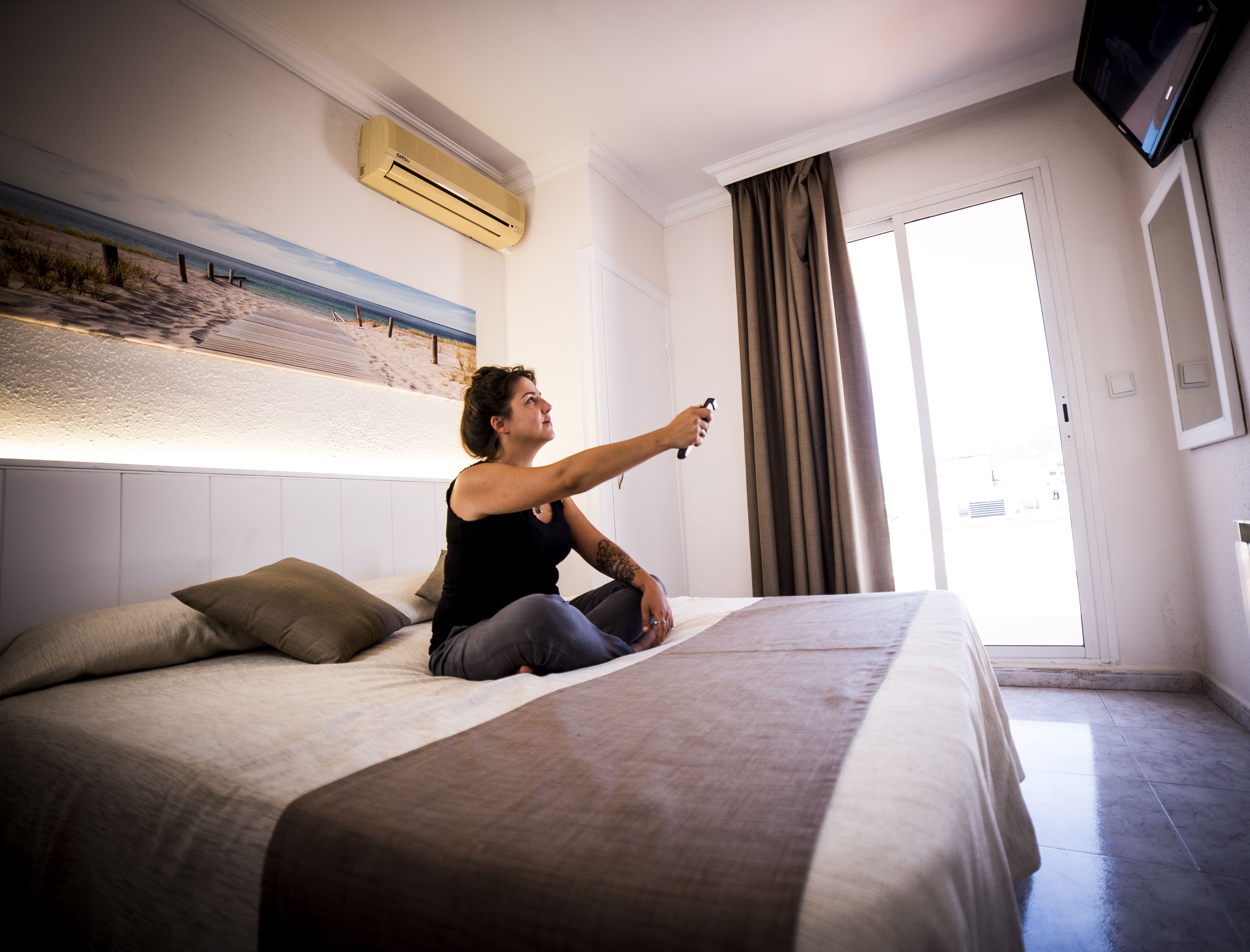 It has an outdoor exit to the balcony, TV (Freeview and satellite), air conditioning, heating, free Wi-Fi.